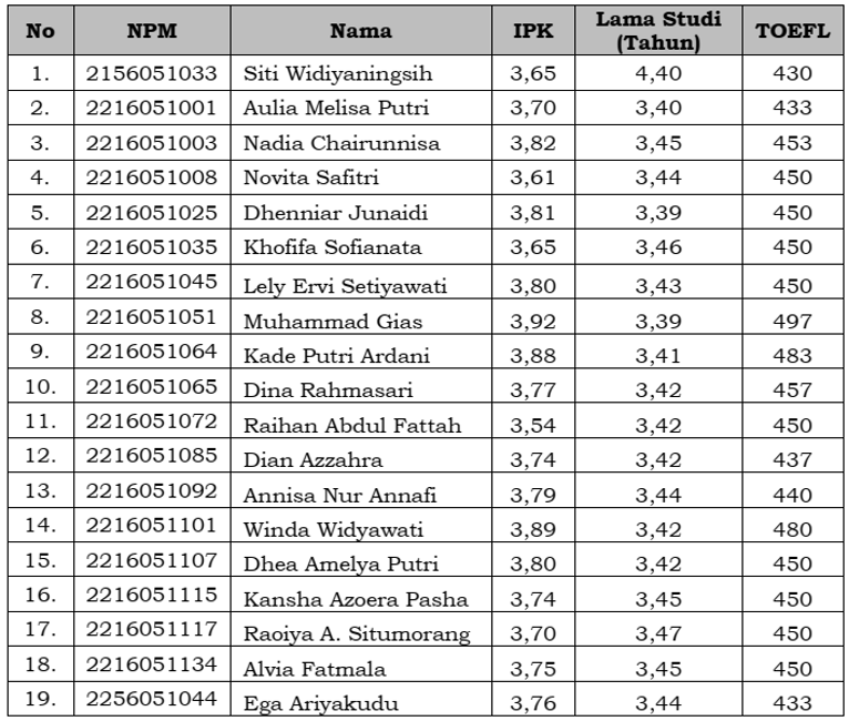 Jum’at, 27 Maret 2026 kembali menjadi hari yang sangat membahagiakan bagi civitas akademika, khususnya bagi Calon Alumni Bisnis Universitas Lampung (Abinila), Jurusan Ilmu Administrasi FISIP Unila. Hari itu sebanyak 19 orang calon Abinila telah mengikuti Yudisium Doktor, Magister, Sarjana, dan Diploma Periode IV Maret Tahun Akademik 2025-2026. Sebanyak 94,7% lulusan calon Abinila periode Maret ini merupakan calon-calon penyumbang terciptanya Kelulusan Tepat Waktu (KTW) bagi Jurusan Administrasi Bisnis. KTW merupakan jumlah mahasiswa Program Sarjana (S1) yang berhasil menyelesaikan studi kurang atau sama dengan empat tahun, jika dibandingkan dengan total mahasiswa aktif pada angkatan tersebut (angkatan 2022).