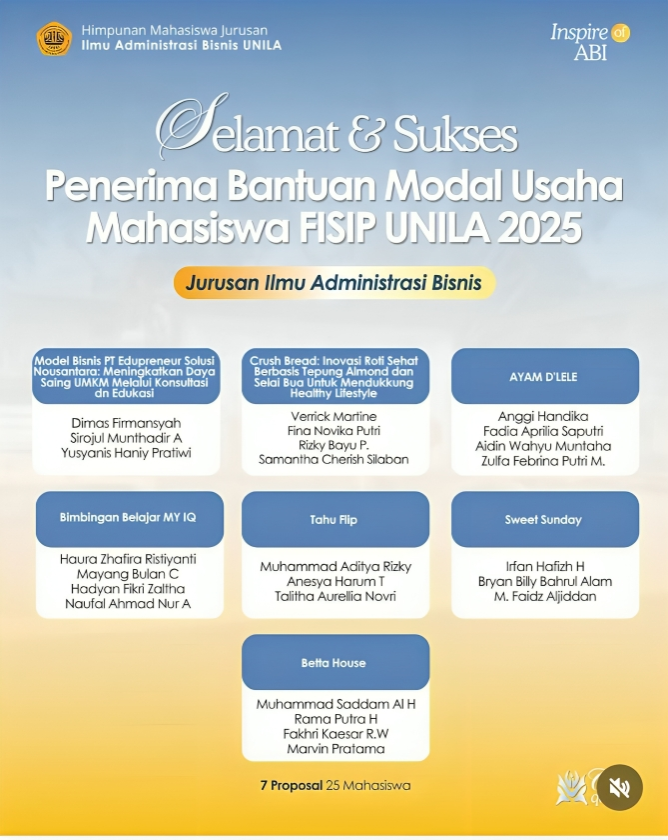 Jurusan Ilmu Administrasi Bisnis FISIP Universitas Lampung kembali menunjukkan eksistensinya dalam pengembangan kewirausahaan mahasiswa. Dalam program Bantuan Modal Usaha Mahasiswa FISIP Unila 2025, sebanyak 7 proposal bisnis dinyatakan lolos dan mendapatkan pendanaan. Capaian tersebut melibatkan 25 mahasiswa yang siap menjalankan beragam ide usaha kreatif dan potensial.