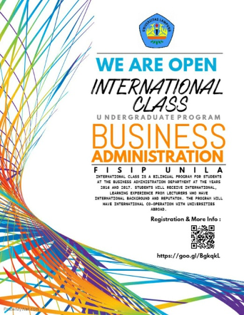 Jurusan Adm. Bisnis FISIP Unila mulai Semester Genap 2016/2017 membuka Kelas Internasional (Kelas Bilingual). Pembukaan Kelas Internasional ini merupakan implementasi dari Immersion Program yang telah dicanangkan oleh Universitas Lampung pada awal tahun 2017. Pada Semester Genap 2018/2019 Jurusan Adm. Bisnis kembali membuka Kelas Internasional bagi mahasiswa angkatan 2018. Mahasiswa yang berminat dapat mendaftar melalui https://goo.gl/BgkqkL. Pada semester ini jumlah mahasiswa peserta Kelas Internasional sebanya 26 orang. Bersama dengan ini Jurusan telah menentukan nama-nama mahasiswa angkatan 2018 yang masuk Kelas Internasional.