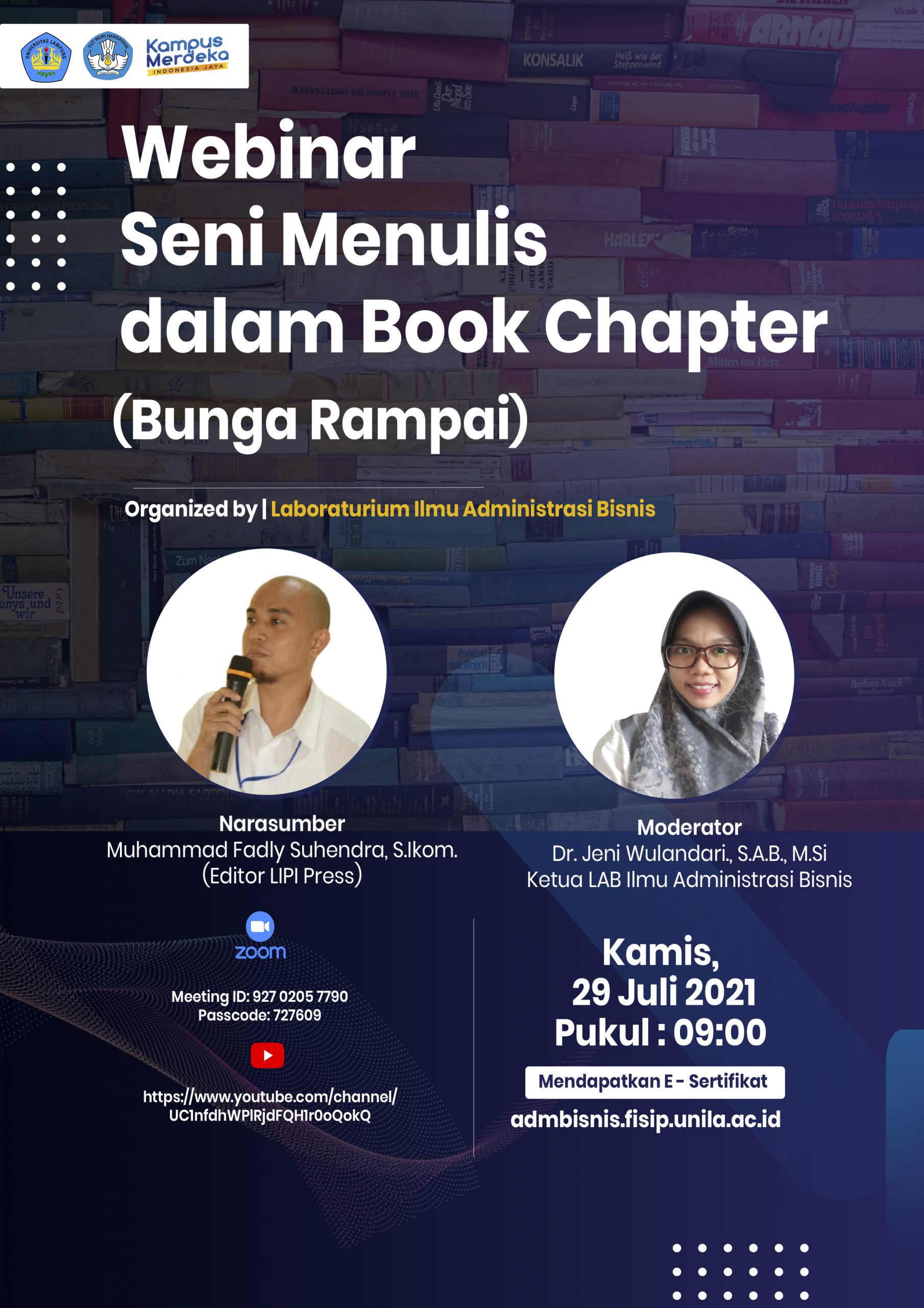 Jurusan Ilmu Administrasi Bisnis akan menyelenggarakan Webinar dengan tema Seni Menulis dalam Book Chapter dengan narasumber Muhammad Fadly Suhendra, S.Ikom. (Editor LIPI Press) pada kamis 29 Juli 2021 pukul 09 : 00 WIB